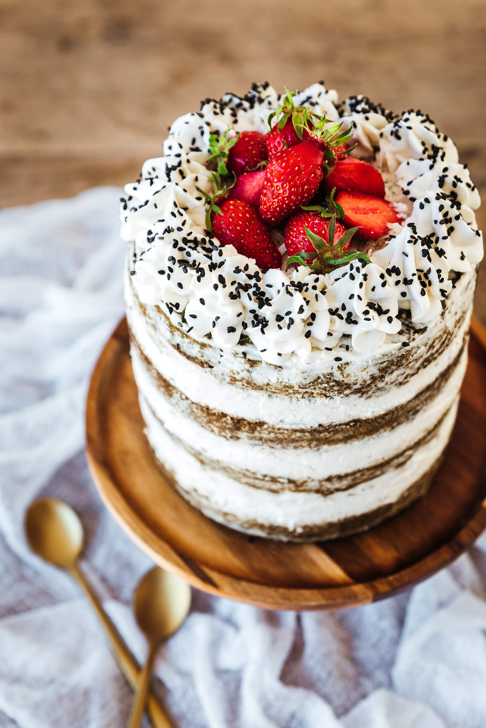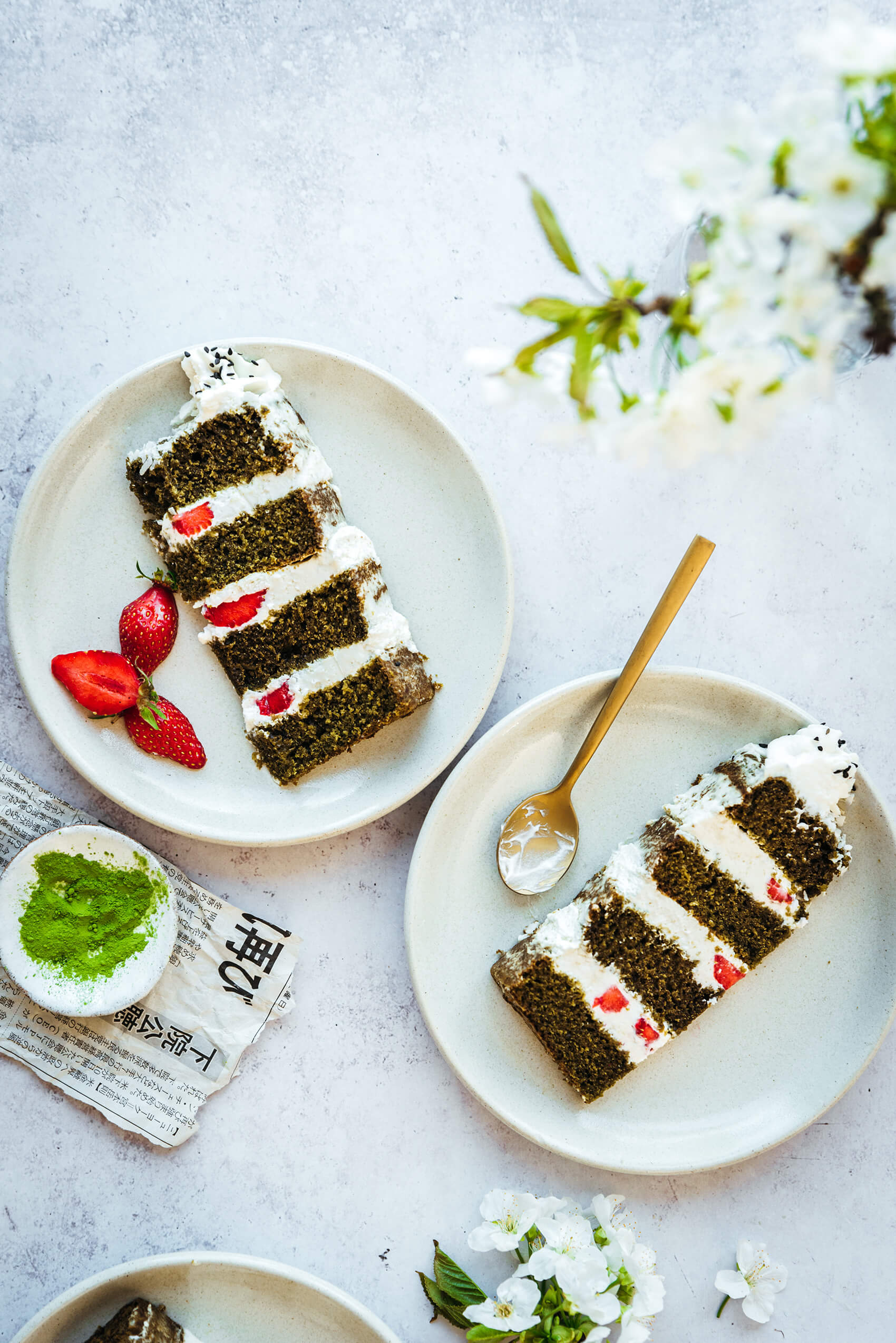 Layer cake au thé matcha, glaçage crémeux noix de coco & fraises