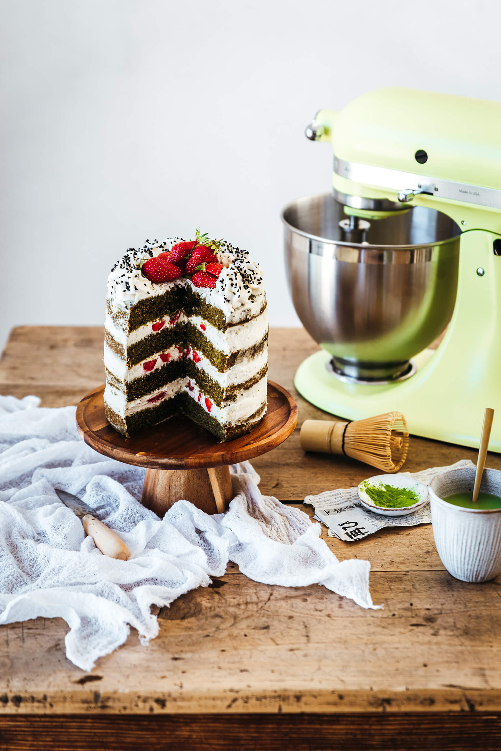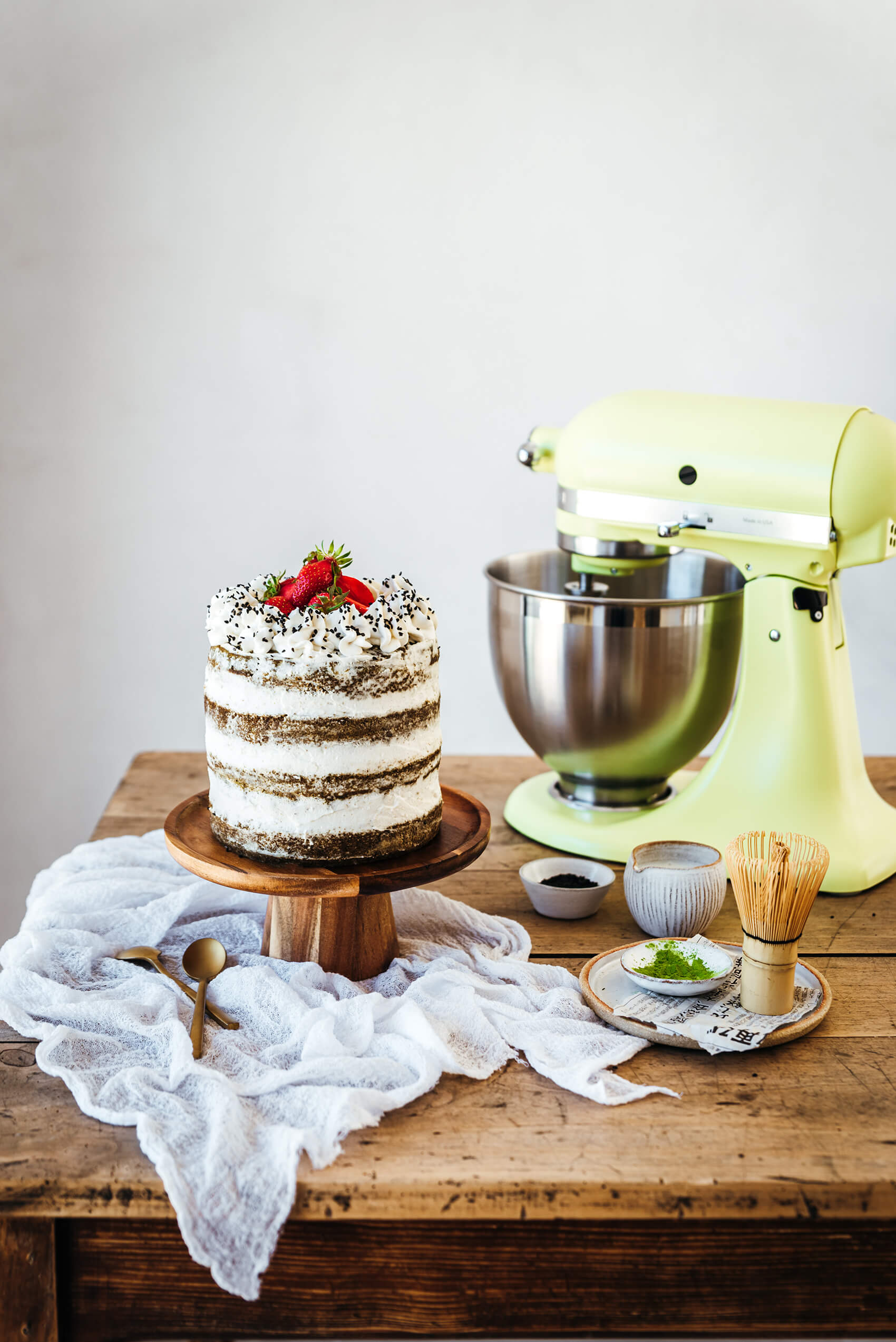 Pour tester ce nouveau coloris en situation, et faire un clin d’œil à cette teinte « Kyoto Glow » lumineuse, j’ai décidé de réaliser un layer cake au thé matcha. Une saveur que j’aime beaucoup utiliser en pâtisserie, et qui s’accorde parfaitement avec la douceur d’un glaçage onctueux à la noix de coco. Ce glaçage est ultra parfumé puisque j’ai utilisé de la crème de coco associée au mascarpone. Ma gourmandise et mon envie de fruits, m’a poussé à y ajouter quelques jolies fraises :) Enfin j’ai ajouté une pincée de grains de sésame noir : j’adore leur petit goût de noisette !