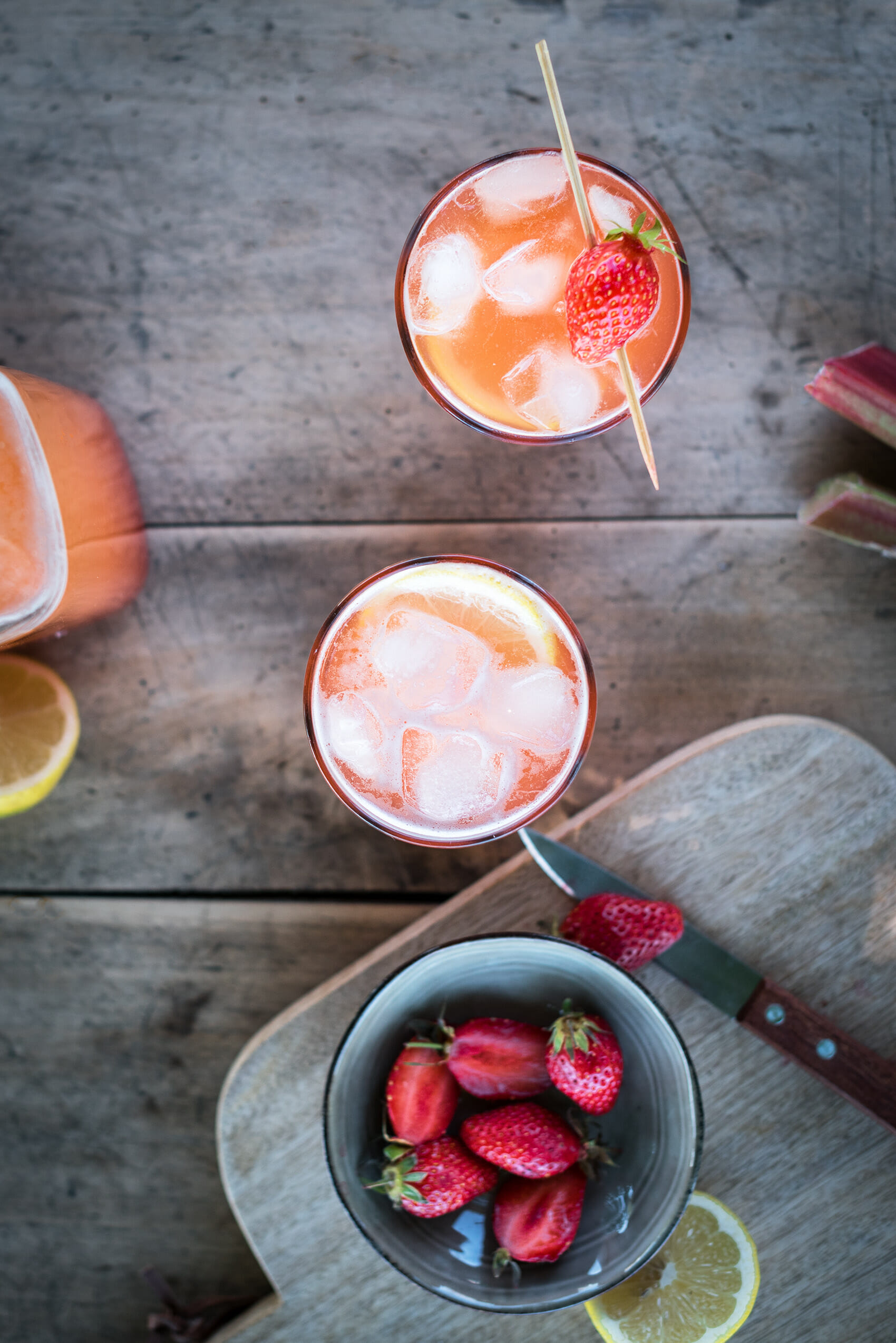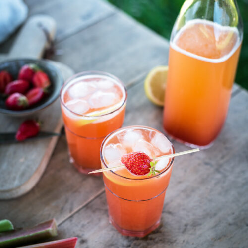On est pas bien là, à l'ombre du chêne ? Le spot parfait pour déguster une petite limonade fraise rhubarbe vous ne trouvez pas ? Je vous avoue qu'en ce moment l'idée d'allumer le four me rebute un peu (ce qui ne m'empêchera pas de faire des tartes ces prochaines semaines ça c'est sûr). Alors pour utiliser ces quelques branches de rhubarbe et cette poignée de gariguettes bretonnes, j'ai tout misé sur une boisson rafraichissante !
