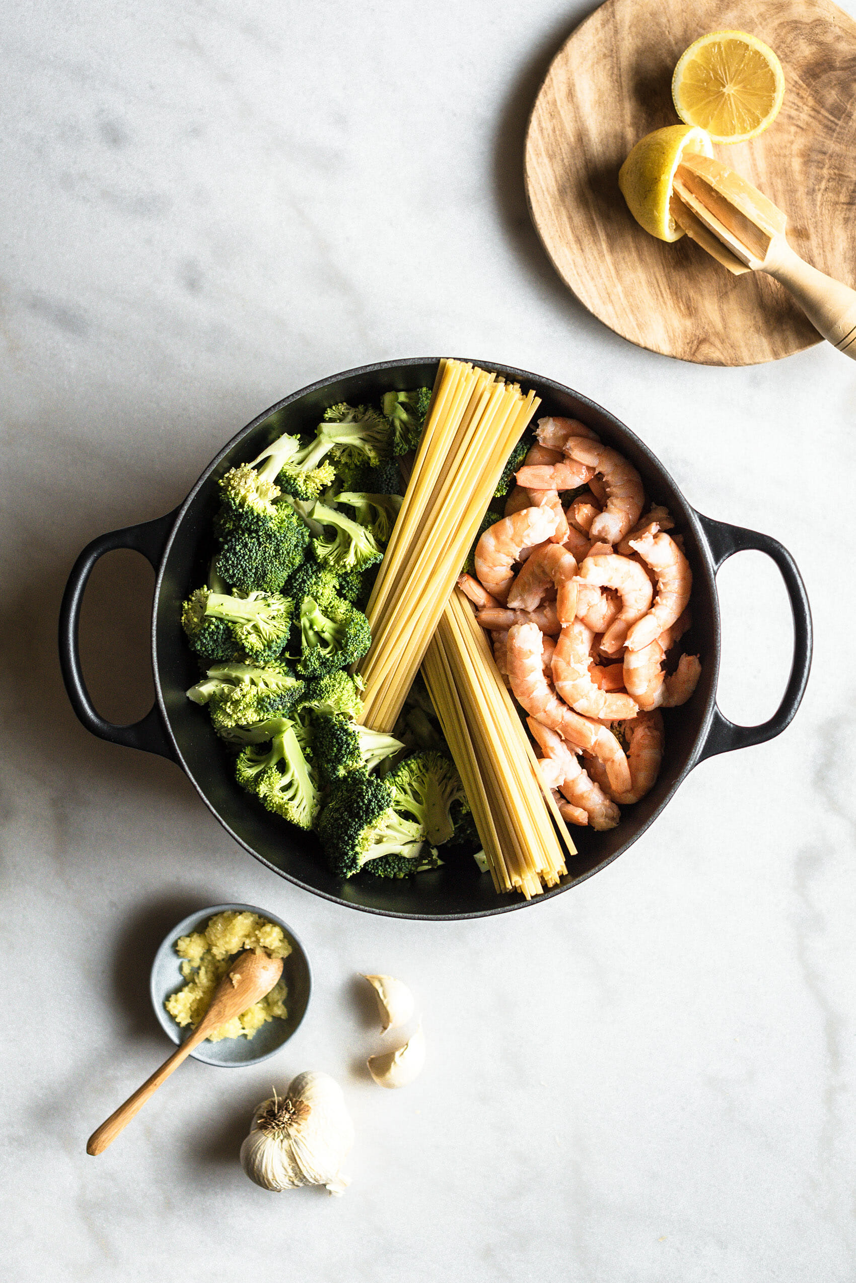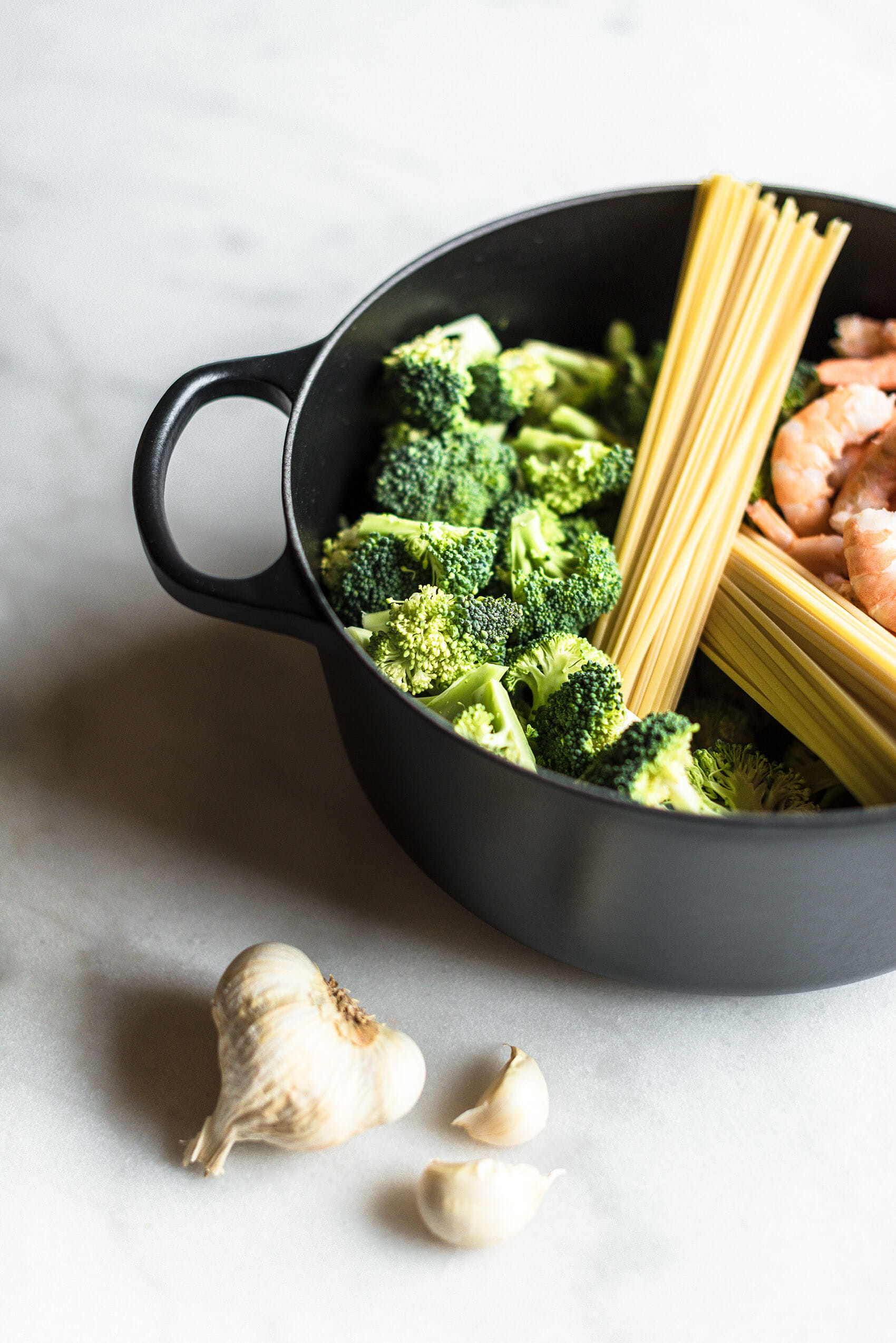 Oui, les brocolis m'ont fait de l'oeil l'autre jour sur l'étal du marché (vive les légumes de saison!), alors j'ai décidé de les associer aux linguines et aux crevettes, relevés d'ail et de jus de citron. Le concept du One pot, vous connaissez ? Il ne vous suffira que d'une seule cuisson dans une cocotte pour préparer votre plat familial. Et en le réalisant avec des pâtes, c'est gain de temps maximal car vous préparer les pâtes et leur garniture au même moment, dans le même plat.